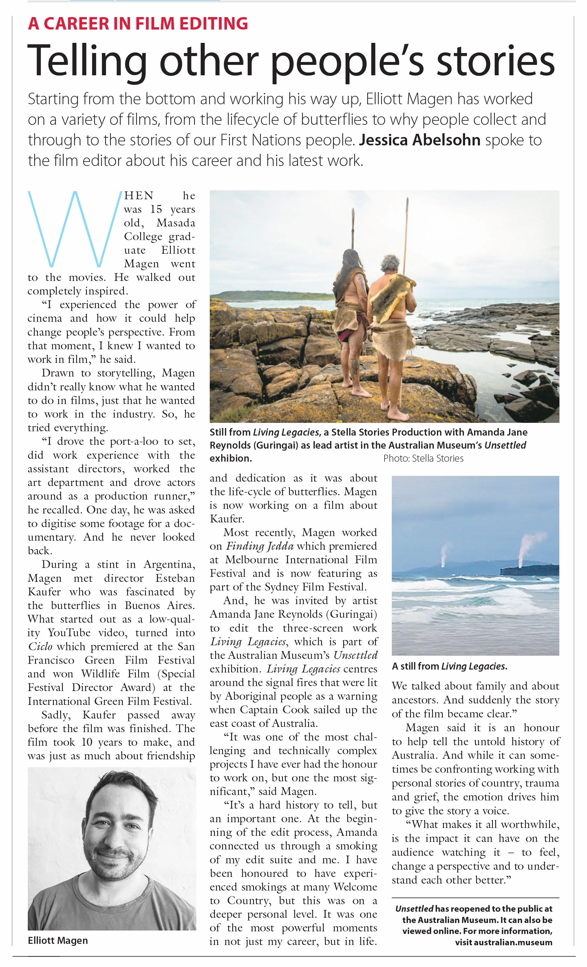 Elliott Magen is a film editor and executive producer working on Cameraygal land (Sydney Australia). With a passion for socially conscious storytelling, he specialises in editing across documentary, drama, and multi-channel video art/installations - often working on projects that challenge traditional narrative forms.